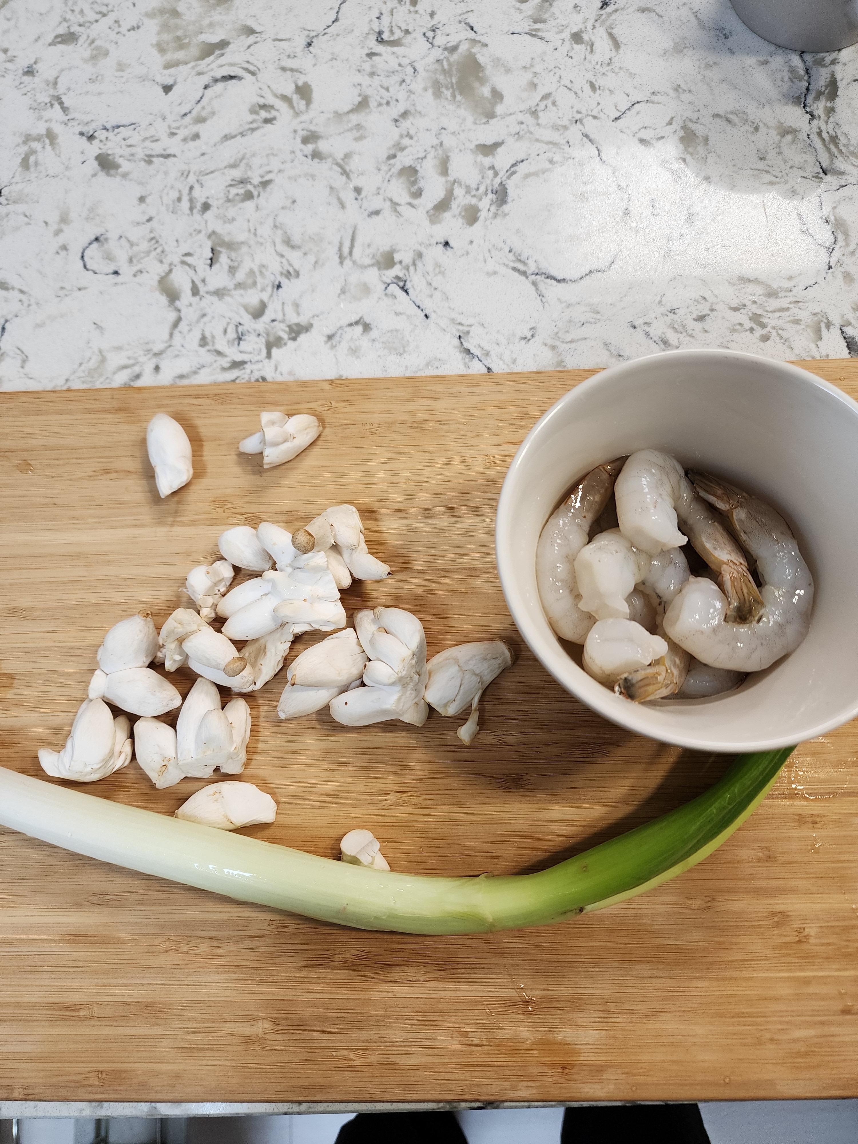우선 버섯(양송이or새송이)한줌과 양파 1/4쪽, 새우 8마리 그리고 대파 한뿌리를 준비해주세요!