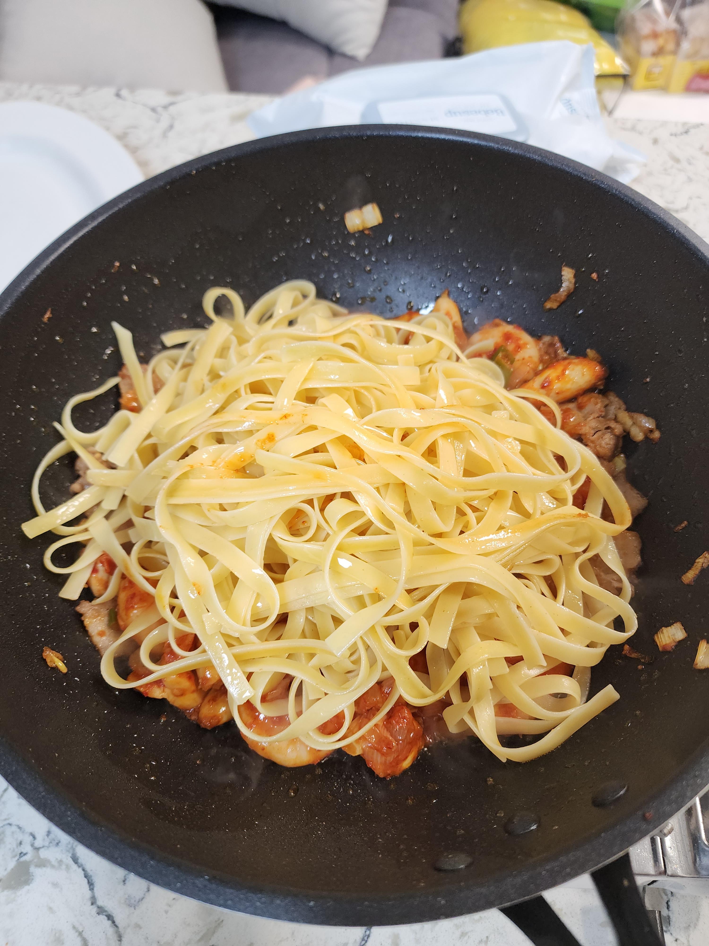 삶아서 올리브오일에 버무려둔 파스타면을 투하하고 투움바토핑이 파스타면에 베이도록 살살 볶아줘요