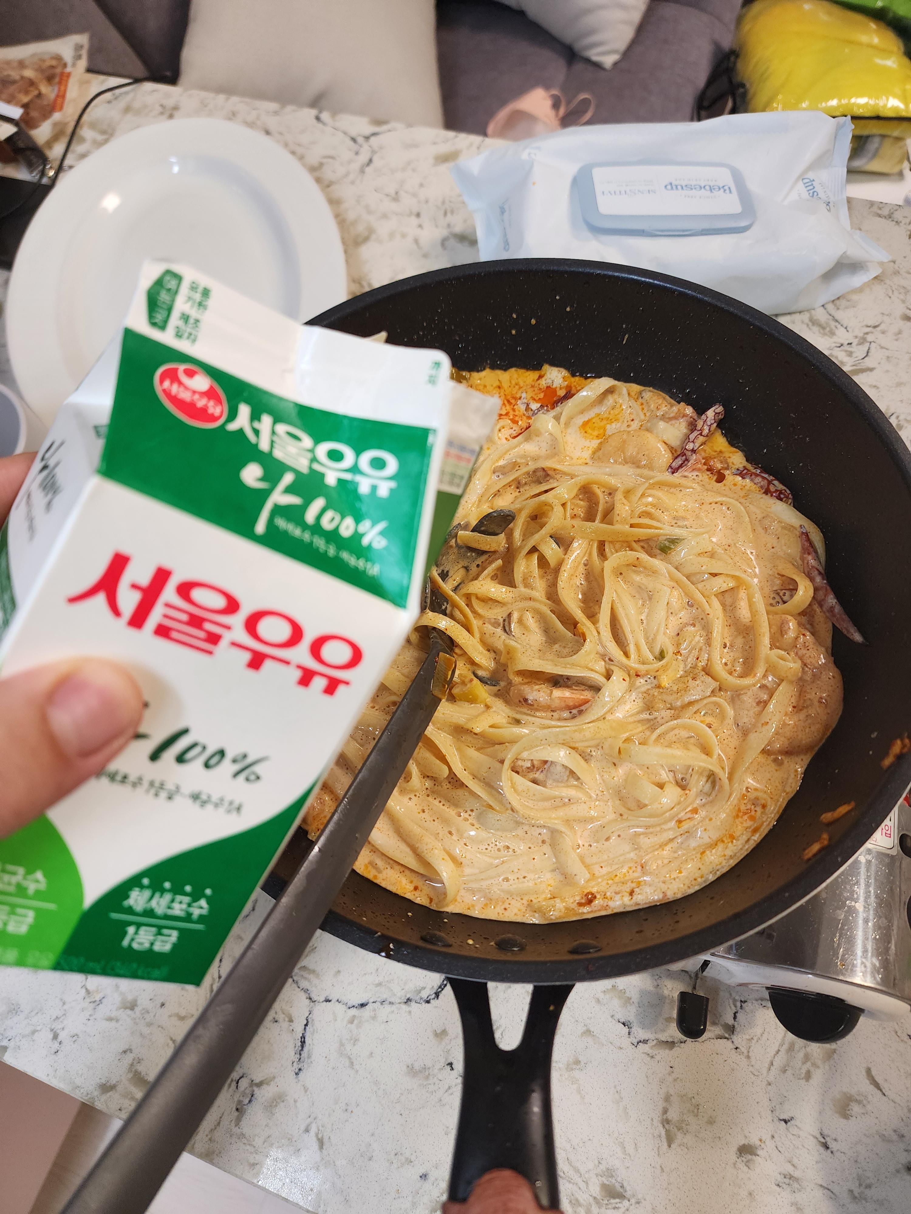 투움바파스타의 소스가 끓어오르면 우유를 조금씩 넣어가며 농도를 맞춰주면서